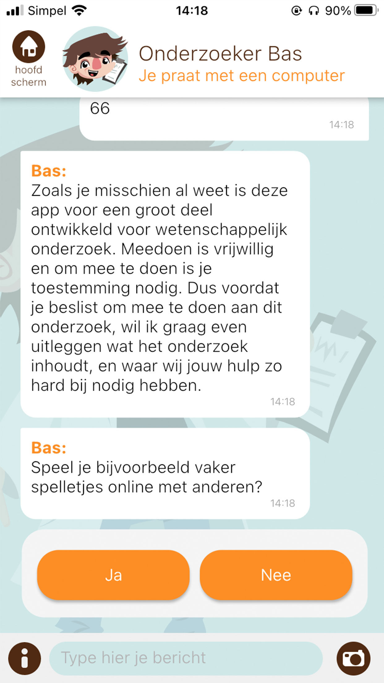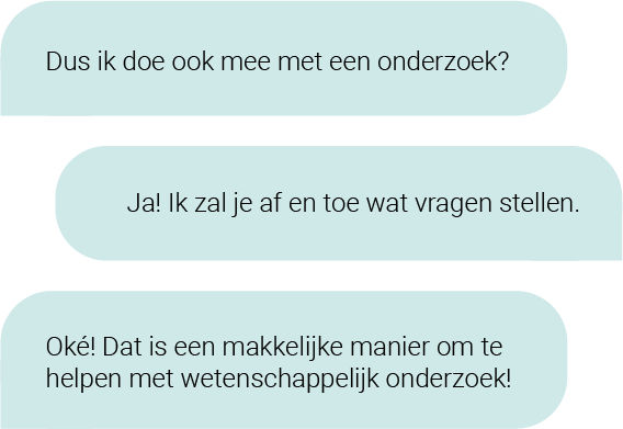 Chat iedere maand met Onderzoeker Bas. Hij stelt je verschillende vragen over je gemoedstoestand en sociale netwerk. Dat is weer eens wat anders dan een saaie vragenlijst.